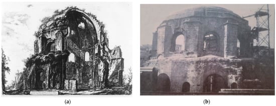 (a) Engraving by Piranesi []; (b) photo of the intervention carried out by Guido Caraffa [].