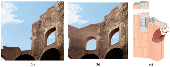 The continuous reduction of the veloidic segments over time and the progressive lack of maintenance of the temple led to a further collapse of the dome in 1828 [,]. Later, it was decided to intervene with multiple restorations to stabilize the structure. Particularly important was the reconstruction of pillar 5, on the first level, between 1830 and 1860, which restored the plan continuity up to the first level. Another significant intervention was carried out in 1942 by architect Guido Caraffa (Figure 3b), who reconstructed the upper parts of the monument. In this intervention, the extrados of the dome was reconstructed, as well as the top covering of the buttresses and the missing brick face. In 2014, it was fully restored, the plan continuity along the elevation with the reconstruction of the upper ring (pillar 5, P5) in reinforced concrete (R.C.) comprehending the foundation, pillar, and beam covered in brick masonry [] (Figure 4).