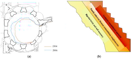 Another aspect of vulnerability concerns the decay of the materials. The dome is composed of three layers of materials (Figure 5b): the intrados layer, consisting of the supporting masonry framework of the ribs in bipedal bricks with sail segments of ashlar tuff; the middle layer of poorly coherent Roman cementitious conglomerate; and the extrados layer of compact consolidated material. The evident deterioration of the intrados and the difficult cohesion between the three layers has reduced the load-bearing capacity of the dome. The decay is still in progress, but it has been partially slowed down on the extrados by the already mentioned interventions; the intrados continues to suffer material decay worsened by the erosive actions of rain and wind [,].