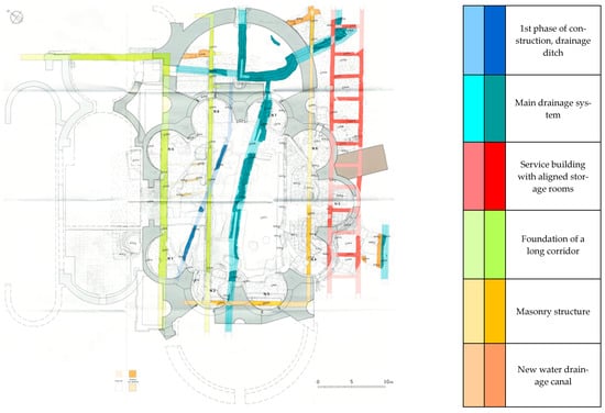 Being that the construction is located in a central, urban part of the city, the temple was erected on different previous Roman remains. According to Lombardo [], there are multiple stratifications of archaeological phases that occurred before the construction of the temple; the area was excavated, and the identified remains are reported in Figure 6 [,]. The foundations of the temple were laid in continuity with the existing niches and were built approximately four meters below the current walking surface. The structure originally had radial plan symmetry so that the loads were equally transferred to each pillar. Nevertheless, the presence of previous subfoundations and subsequent additions of stabilizing elements have altered the thrust lines of the structure. This situation could have led to a progressively increasing stress concentration in the southeast area of the temple where the collapses were initiated.