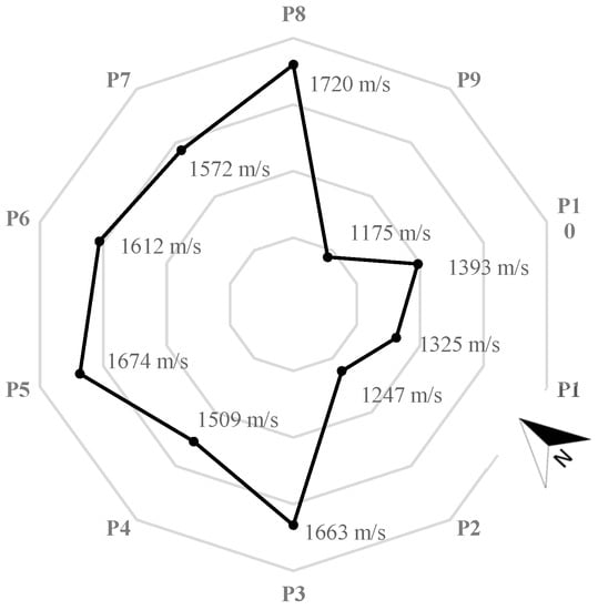 Several diagnostic campaigns were carried out on the so-called Temple of Minerva Medica. In 2018, the Italian National Agency for New Technologies, Energy and Sustainable Economic Development (ENEA) performed nondestructive testing (NDT) on the temple []. The results provided by ENEA include the sonic velocity of the P-wave recorded through the ten pillars at the ground level, reported in Figure 7. The values have been calculated as averages of the velocities measured at six points of each pillar. The results highlight a group of pillars (P9, P10, P1, and P2), in the east and south sections, with lower velocities, and the remaining pillar with higher velocities. This result identifies less-compact material in the southeast section of the monument, in agreement with the recorded collapses, the widest niche (N5), and the reconstructed pillar (the first arcade of pillar P1 was rebuilt in brick masonry during the 1830–1860 restoration).