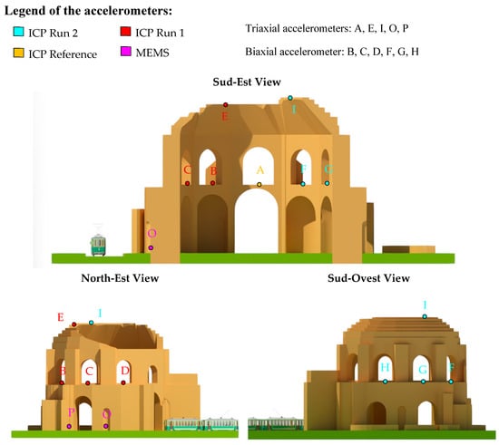 Dynamic monitoring of the temple was performed with different types of instrumentations [,]. Twelve ICP (Integrated Circuit–Piezoelectric) accelerometers (10 V/g sensitivity, measure range of ±0.5g, frequency range from 0.15 to 1000 Hz, and 8 μg rms resolution) were positioned at five different locations for acquisition. Two setups were recorded, each one for a period of approximately 45 min; only one location was kept unvaried (A) as a three-dimensional reference to merge the results of the operational modal analysis (OMA). Another set of two MEMS accelerometers recorded the vibrations at the base of the construction to monitor the input. The dynamic monitoring setup is reported in Figure 8.