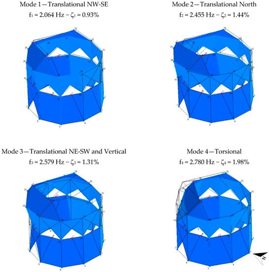 The ICP measurements were recorded with a sampling frequency of 441 Hz and were later resampled at 60 Hz according to the significant frequency band of the building. The data was filtered with a band-pass filter between 0.2 and 30 Hz; the cross-spectra were calculated with 1024 time lags and 1% windowing. The modal parameters were extracted with the PolyMAX method implemented in the software Simcenter Testlab []. The merging and scaling of the modes extracted in Run 1 and Run 2 were performed in accordance with the modal assurance criterion (MAC) correspondence in the band to the three common degrees of freedom (DOFs) of reference node A, as reported in the previous works of these authors. The extracted mode results were independent, considering most of the cross-MAC was between 10 and 20%. Mode 2 and mode 3 represent the only exceptions, with a higher MAC, of 50%, and thus a medium correlation of the two modes. The modal parameters and the main features are summarized in Figure 9.