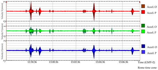 The quantification of the vibrations induced by rail traffic was carried out with the MEMS triaxial accelerometers positioned on the southwest side of the construction. The accelerations were converted into velocities to compare the data with the limit values suggested by Italian regulation UNI 9916:2004 []. In Figure 10, the velocities recorded by accelerometers O and P in a time window of 10 min are reported; it is evident that in the disturbance caused by the tram at 12:58:44, the velocity of accelerometer O in the X-direction reached the maximum value of 2 mm/s, which is close to the limit value for the horizontal component of velocity, namely the Peak Component Particle Velocity (PCPV), imposed by the regulation (2.5 mm/s). The difference in amplitude of the accelerations depending on location is interesting, considering that both sensors had an equal distance, of approximately 4 m, from the rails.