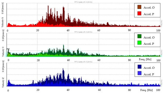 FFTs of the velocities recorded by the MEMS accelerometers in locations O and P.