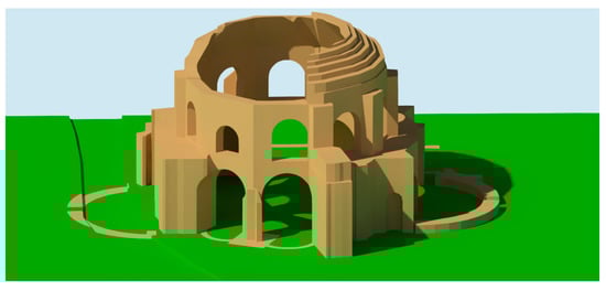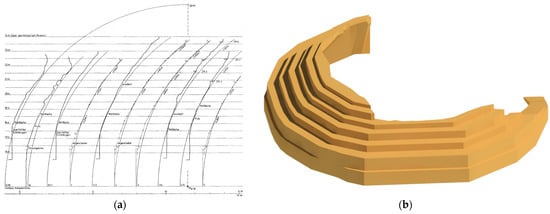 In the second stage, the architectural line drawings of the construction were imported in Revit and used as references for three-dimensional modeling of the main structure. Particular attention was paid to the reconstructed arcade in reinforced concrete (R.C.) on the second level in correspondence to niches N4 and N5. Then, the partially collapsed dome was modeled, starting from profiles represented in the cross-section of the veloidic elements reported by Rasch [] (Figure 13a), which were swept and joint along the plan of the dome (Figure 13b).