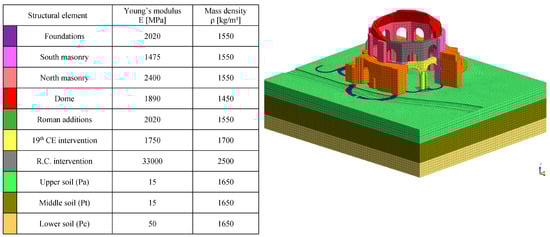The geometry and information of the HBIM were used to define the finite-element model in Midas FEA NX []. The FEM was formed of 110’056 nodes and 163’636 hexahedral and pyramidal elements of variable sizes between 80 to 20 cm. The structure was modeled with an equivalent isotropic material that was substantially heterogeneous. The material was subdivided into six typologies depending on the construction period (subfoundations and foundations, original configuration, Roman stabilizing additions, 19th CE intervention, modern R.C. intervention) and differences due to the construction technique (the dome).