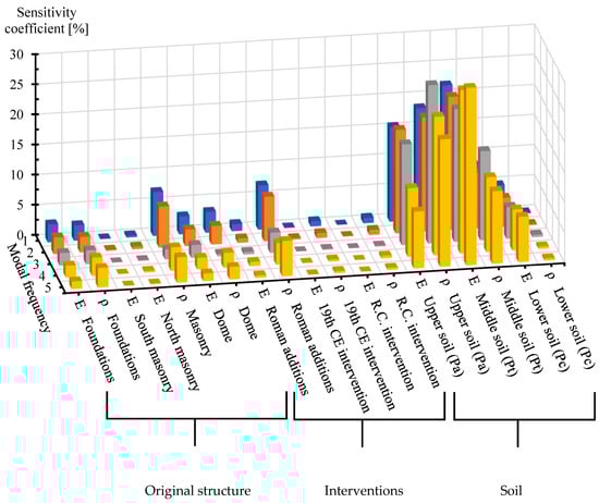 According to the eigenvalue analysis, the most significant modes of vibration were the first three modes, which contained the highest modal effective masses: 26% in the X-direction for the 1st mode, 26.2% in the Y-direction for the 2nd mode, and 21.7% torsion around the Z-direction for the 3rd mode. The sensitivity coefficients for each significant material parameter are reported in Figure 16.