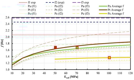Different eigenvalue analyses were performed by varying the moduli of elasticity of the three soil layers to evaluate the effect of soil stiffness on the first three modal frequencies (Figure 17). Similar trends of variation were observed for the upper (Pa) and middle (Pt) layers, while the lower layer (Pc) minorly influenced the modal frequencies (as confirmed with the sensitivity analysis). The parametric analysis highlighted underestimation of soil stiffness in the FEM, considering the proposed modeling of the SSI. Thus, the initial values of the modulus of elasticity were incremented considering the soil characterization reported by Ventriglia [] for the same soil typology in proximity of the site.