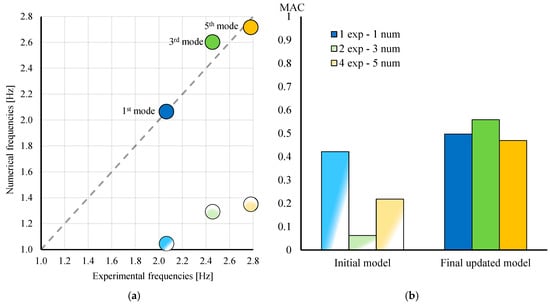 The numerical modal deformation of mode 2 did not sufficiently match any of the experimental modes; thus, it was discarded. The optimum correlation between the models was found between experimental modes 1, 2, and 4, with numerical modes 1, 3, and 5. This consideration agrees with the medium correlation identified between experimental mode 2 and mode 3, which represents a similar modal behavior of the structure, thus possibly assumed to be a single relevant feature.