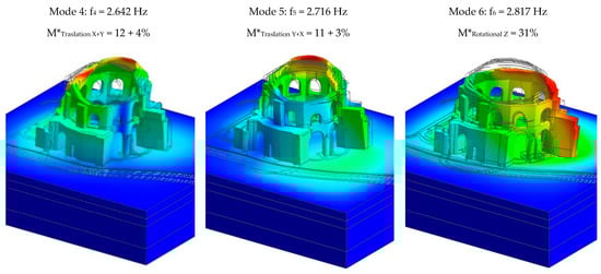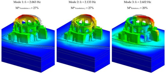 It is of interest that the soil had the largest influence on the modal frequencies, followed by the original structure (with a main role for the dome) and the mass density of the Roman additions. In general, the results for the mass density of the materials were more influential than Young’s modulus, besides the moduli of elasticity of the soil (which expressed a restraining function for the main structure) majorly affecting the modal frequencies. Being a physical quantity, mass density is not affected by large uncertainties or variations from defined reference values. On the other hand, being a mechanical elastic property, Young’s modulus is more affected by variations produced by external factors: for example, damage, material morphology, and environmental parameters. Soil is a highly heterogeneous medium, and its mechanical properties vary significantly with depth and water content. This aspect, along with transmission of dynamic forces between soil and structure, is manifested in the phenomenon of the soil–structure interaction (SSI). Considering the complexity in modeling of SSI and the intrinsic variability of geotechnical parameters, a parametric analysis was carried out to calibrate the modulus of elasticity of the soil in order to reduce the gap between the numerical and experimental modal frequencies.