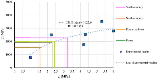 The mass density of the opus cementitius was assumed equal to the average experimental results found by Giavarini and Ferretti [] for similar Roman constructions. In particular, an average value of about 1550 kg/m3 was assumed for the main structure, and with respect to ancient Roman construction techniques, lighter masonry (with lower mass density) was assumed for the dome. The dynamic elastic modulus of the original structure has been defined from the sonic velocities provided by Roselli et al. [], who applied the well-known equation of wave transmission. The experimental results highlighted two groups of pillars with similar sonic velocities; consequently, the south masonry was evaluated using the average velocities of pillars P1, P2, P9, and P10 while the north masonry was evaluated using the average velocities of the remaining pillars, P3, P4, P5, P6, P7, and P8 (Figure 1b). For the ancient Roman additions and the system of foundations, a modulus derived from the average of all of the experimental velocities was assumed. Being that the elements in the opus cementitium were composed, in the majority, of cementitious material, the dynamic modulus of elasticity was correlated to Young’s modulus (static) with the relationship from Lee et al. []. The material parameters employed for the 19th CE and modern R.C. interventions were assumed with engineering judgment supported by the values suggested in the Italian code [] (brick masonry and C30/35).
