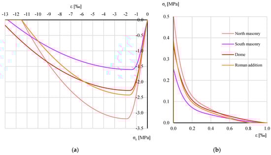 Stress vs. strain curves of the structural elements in opus caementicium: (a) compression and (b) tension.