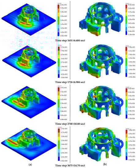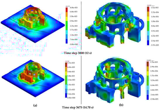 In this study, the significant contribution of the numerical simulation was the representation of the stress state of the structure, which is generally complex to detect experimentally, and if the numerical model is properly calibrated, it returns quite reliable results, at least in terms of maximum stress concentration. In both of the analyses, the structure results particularly stressed the north (between P4 and P5) and south (between P10, P1, and P2) arcades on the first level (Figure 1 as reference). In the MLA, the northeast portion of the temple was barely affected, while in the NLTHA, the vibration affected most of the structure (even if the input were assigned at the base node of the southeast portion). This result is understandable because in the MLA, the load on the rails interested, in the first place, the closest portion of the temple located at 4.5 m, and being that the soil was interposed between the action and the structure, this operated as a damping medium and significantly reduced the dynamic action on the farthest portion of the temple (the northeast side).