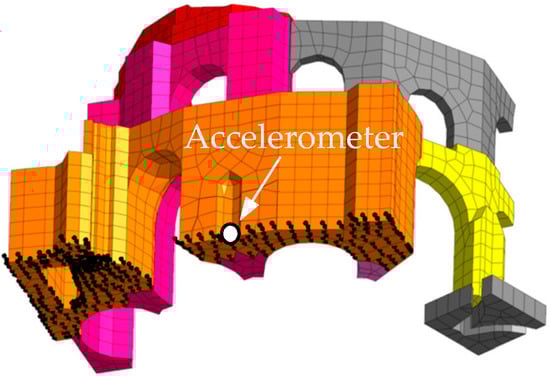 Dynamic identification records the response accelerations of a structure in a limited number of measurement points, which are chosen based on the theoretical largest displacements, accessibility, and, of course, budget. Santini et al. [] employed a FEM to estimate the dynamic features of the Octagonal Hall at the Baths of Diocletian and optimally plan the dynamic monitoring system and the testing campaign. This preliminary simulation is also useful to comprehend structural behavior and evaluate the validity of the model’s assumptions.