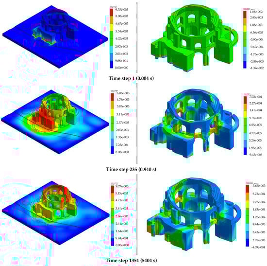 Figure 24 shows the results of the nonlinear time-history analysis in terms of displacement and principal tensile stress for the most significant time steps.