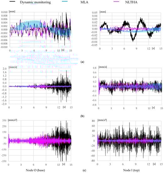 As a basis for comparison, a nonlinear time-history analysis (NLTHA) was also considered by setting of the same parameters (time step, duration, damping) as the MLA. The time history simulated the dynamic load of the tram by dynamically applying, at the base nodes of the structure, the three-dimensional displacement monitored by the accelerometer in node O during the tram passage (the displacement as the double integral of the recorded acceleration). The dynamic equilibrium equation in nonlinear time-history analysis uses the Hilber–Hughes–Taylor method [] (a general form of the Newmark method) as implicit time integration to calculate the convergence solution for each time step using the nonlinear finite-element solution: a method of converging accumulated incremental solutions from iterative calculations for the correct solution. Figure 23 shows in white the position of the accelerometer that recorded tram-induced vibrations and in black the nodes of the model where displacement time history was applied.