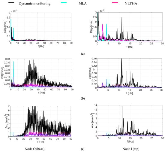 In terms of displacements (Figure 25a and Figure 26a), at the top, there was reported displacements about two times greater than at the base; the numerical and experimental amplitudes were similar; and at the base, there was a slight deamplification of the NLTH displacement after 10 s and the MLA displacements for the whole duration, possibly caused by unprecise calibration (or modeling) of damping. The frequency content differed significantly in the MLA, where the frequency narrowed around 4 Hz and highlighted a quasistatic component. The NLTHA is representative of the experimental displacements by capturing the relevant peak at 2.5 Hz. At the top, the gap between experimental and numerical increased; the dynamic monitoring data detected a large frequency content, between 0.5 and 1.5 Hz, which was not present in any of the numerical results. It is realistic to assume that this component is connected to the effect of wind pressure on the structure or on the cables of the accelerometers (being that the structure is quite high and open to wind influence from the north to the southeast side). The other peaks of displacements, between 8 and 17 Hz, are possibly connected to the higher modes excited by the tram, which were not detected in the simulation due to the defined time step for numerical integration (0.004 s).
