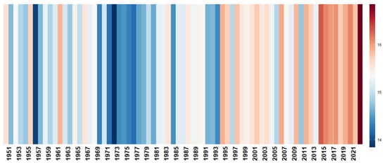 The most relevant climate-related hazard in València is heat stress, with an extraordinary impact on human health and well-being that is foreseen to worsen in the coming decades due to climate change. The historical data collected for average temperature in València in the period 1951–2022 showed an increasing trend (Figure 1). The period 1994–2021 was among the warmest years on record for surface temperature (except 2010).