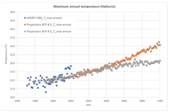Maximum annual temperature in València. Reference period 1971–2000. Source: Processed from data from Adaptecca’s climate scenario viewer.