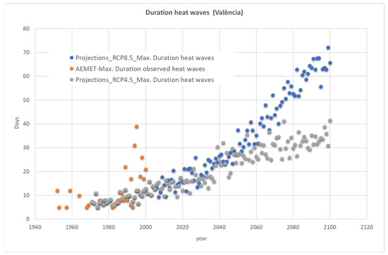 Maximum duration of heat waves in València. Reference period 1971–2000. Source: Proceeding from data from Adaptecca’s climate scenario viewer.