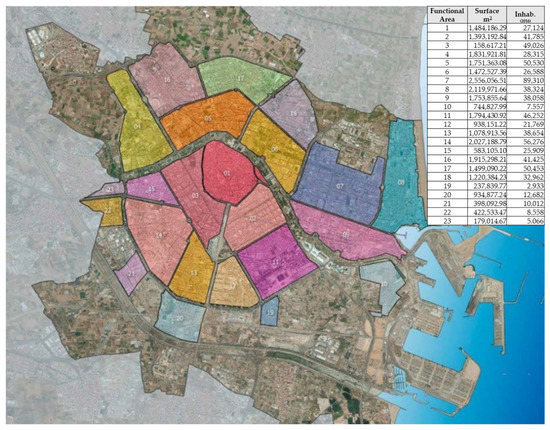 The revision of the General Development Urban Plan applied an innovative approach with a strong spatial component that materialized in the delimitation of 23 functional planning areas, as described in the Special Plan of Urban Quality Guidelines of València [28] (Figure 4).
