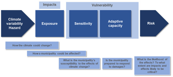 Risk was understood, following the IPPC approach, as the result of the combination of hazard, exposure, and vulnerability, the latter being divided in turn into sensitivity and adaptative capacity [35].
