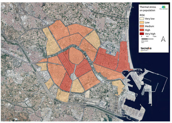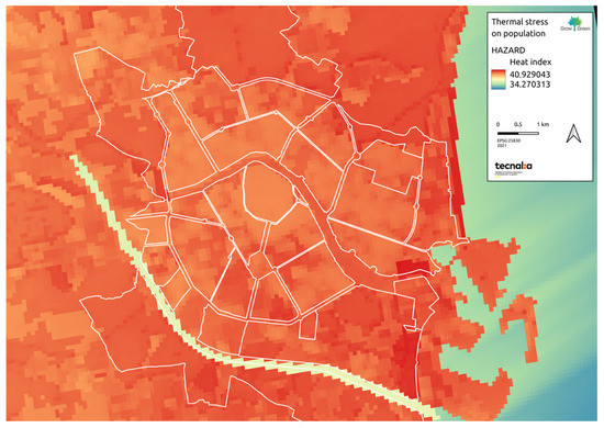 The vulnerability and risk assessment was carried out for thermal stress and its effect on the population, as it is one of the priority climate hazards in Mediterranean cities, and València is not an exception [29,30]. Thermal stress on the population was identified in the city’s Strategic Agenda 2030 as well as Missions València 2030 [25].