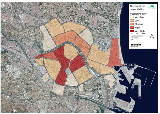 Results of the vulnerability assessment of the functional areas of València against thermal stress—Vulnerability. Source: Own elaboration.
