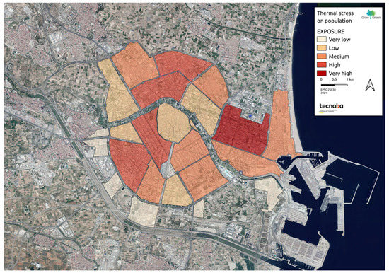 Results of the vulnerability assessment of the functional areas of València against thermal stress—Exposure. Source: Own elaboration.