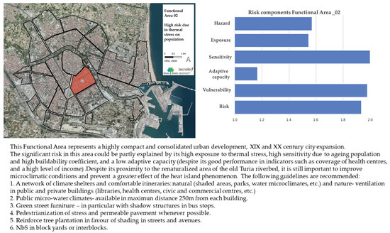 Five out of the 23 functional areas presented high risk due to thermal stress on the population. This high risk was explained by the combination of high levels of hazard, exposure, and vulnerability. Indicators related to buildability, the efficiency of the urban fabric, and the population over 65 years contributed to the sensitivity of these areas. On the other hand, the level of civic association involvement, ratio of public facilities, free spaces, connection with the garden, and income per household partially explained their low levels of adaptative capacity.