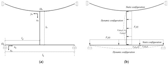 - The longitudinal vibrations of the cable and the beam were ignored, and only the longitudinal elongation of the cable due to the transverse motion of the beam was considered;