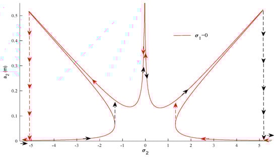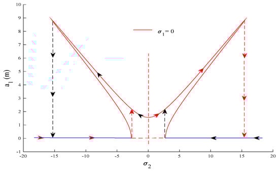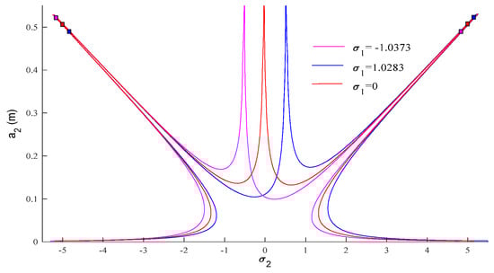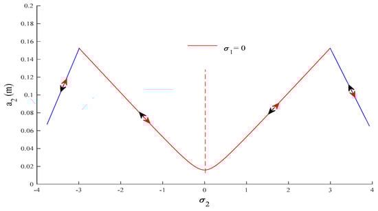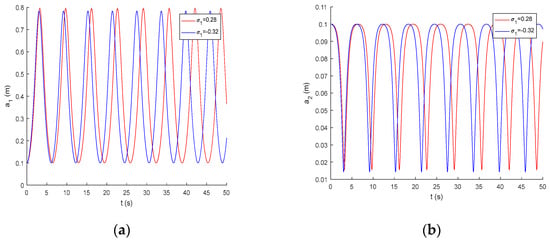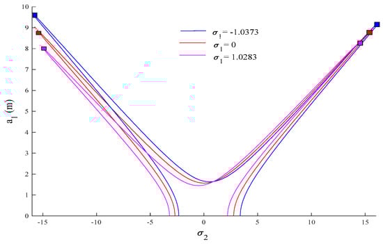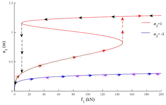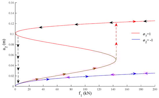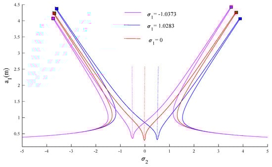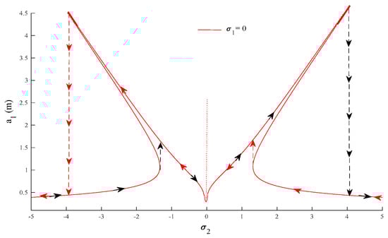 - In forced oscillation, no matter the excitation forcing the sling or the beam, the amplitude–frequency response of the cable had an obvious jumping phenomenon. The amplitude–frequency response of the beam had a jumping phenomenon only when the excitation forced the sling. On the right side of the baseline, the responses of the sling and the beam both exhibited hardening behavior, while on the left side, they exhibited softening behavior. In the case of σ1 = 0, the amplitude–frequency response curve was symmetrical along the baseline. When σ1 > 0 and σ1 < 0, the baseline slightly shifted to right and left, respectively, and the amplitude–frequency response curve was no longer symmetrical.