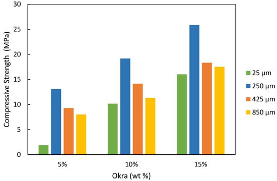 Figure 2, adding 5%, 10%, and 15% okra by weight increased the compressive strength by approximately 35%, which can be attributed to the increased amount of medium-sized silica sand particles. Observations reveal that incorporating okra into the silica sand mixture enhances the adhesion between the sand particles, which leads to greater compressive strength. This is attributed to the high amounts of galactose, rhamnose, and galacturonic acid present in okra, which possess crosslinking properties that increase the adhesive potential. Furthermore, the strength was found to diminish by 40% between 250 µm and 425 µm in all the weight percentages of okra added. The adhesion between particles can be affected by particle size and the constant load applied. Smaller particles of silica sand of 25 µm produced the lowest compressive strength regardless of all amounts of okra added. This clearly indicated that the particle size of silica sand affected the overall strength of the composite.