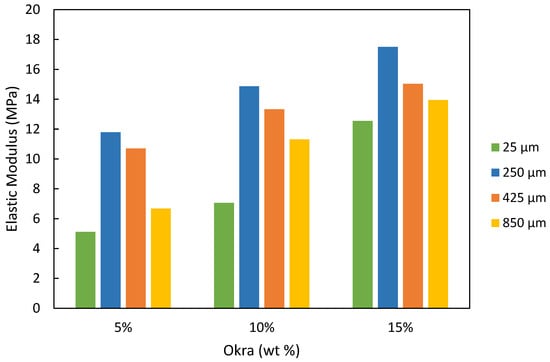 37]. The elastic modulus of the 25 µm silica sand was the least among all particle sizes due to the substantial presence of dust particles that impaired its mechanical characteristics. Conversely, the 250 µm sand particle size had the highest elastic modulus, regardless of the amount of okra added to the mixture.