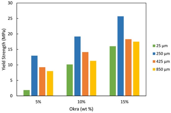 Figure 4. With the exception of sand particle size and the quantity of okra added, all other variables remained constant. The yield strength of the material was observed to decrease by an average of 35% when transitioning from 250 µm to 425 µm sand particle sizes, irrespective of the amount of okra incorporated into the mixture. A 14% decrease in yield strength was recorded between the 425 µm and 850 µm sand in all the amounts of okra added. The outcomes demonstrated that the size of the sand particles had a significant impact on the yield strength of the silica sand. As a result, it was determined that there exists a connection between the proportion of okra added to a sand blend containing 250 µm particles and the composite’s yield strength. To be more precise, augmenting the okra proportion from 5 wt% to 15 wt% resulted in a 43% growth in the composite’s yield strength. Meanwhile, introducing okra from 5 wt% to 10 wt% led to a 50% surge in yield strength for the 425 µm silica sand. A light increase of 20% yield strength was pointed out at the 25 µm sand upon adding 15 wt% okra. Generally, yield strength was found to increase with an increase in the amount of okra added. This is because okra acted as a binder between the materials [