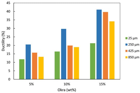39]. In all of the tested proportions of okra, ductility was observed to be low for the 25 µm sand particle size. This can primarily be attributed to the abundance of extremely small sand and dust particles present in the mixture. The addition of 15 wt% okra by weight to the silica sand in combination with the 250 µm sand particles produced the highest percentage and, therefore, the best ductility.