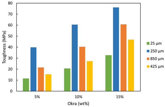 38]. The 250 µm sand produced the highest toughness in all the percentages of okra added. This was mainly due to the high amount of medium-sized particles of sand used, which increases toughness. A high amount of very fine particles in silica sand can increase the water-silica sand ratio, reducing the toughness of the material. Moreover, the excessive presence of fine particles can enlarge the surface area of the composite, which can elevate the possibility of chemical reactions and modifications in the material’s characteristics. Overall, the presence of very fine particles and dust can have a significant impact on the toughness of silica sand. To improve the toughness of the material, it may be necessary to reduce the amount of very fine particles and impurities present, or to use a different type of silica sand with a more suitable particle size distribution and lower impurity content [