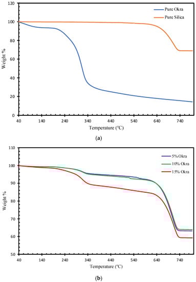 47]. As pure silica and pure okra have different properties, they degrade differently under temperature, as indicated in