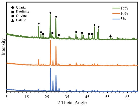 Figure 10. All the samples showed the existence of four major minerals: quartz, kaolinite, olivine, and calcite. The difference in the samples was mainly in terms of the number of different compositions of the minerals; additionally, the crystalline silica sand particles dispersed within higher weight percentages of the bio-binder matrix, such as at 15 wt%, will generate new sharp peaks [