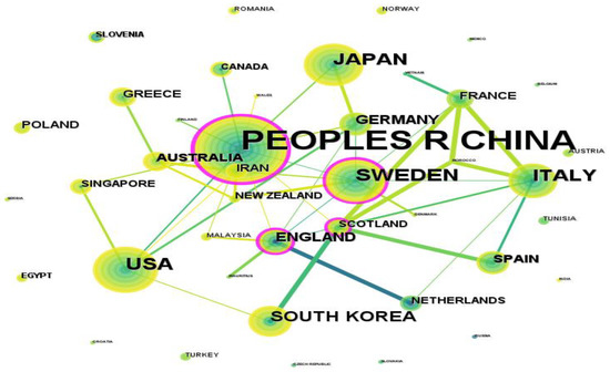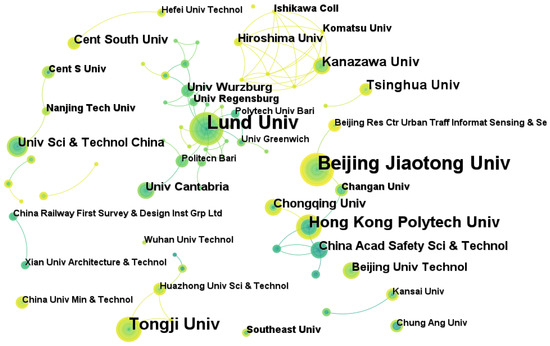To achieve a more complete comprehension of the distribution of publications in this field, an analysis was conducted by integrating the country cooperation (Figure 3), the institution cooperation (Figure 4), and the country and institution publication statistics (Table 3). Figure 3 illustrates the cooperation relationship among countries. Clearly, China has the largest node, indicating that it holds significant research power in the research efforts within this field. Moreover, the periphery nodes surrounding China, Sweden, Scotland, and the United Kingdom are noticeably purple. This suggests that they possess higher betweenness centrality [22], and have played an important role in advancing research and development in underground space evacuation. As shown in Figure 4, a significant portion of institution cooperation occurs within the same country. For example, Beijing Jiaotong University and Chang’an University are both located in China, while Hiroshima University and Kanazawa University are situated in Japan. This suggests that cross-boundary cooperation among institutions is relatively weak, with most institutions tending to collaborate with others within their own country, possibly due to factors such as language barriers, cultural differences, and so on. Therefore, effective measures should be taken in the future to promote international cooperation and exchange among institutions, and to facilitate the sharing of knowledge and resources, in order to advance the development and progress in this field.