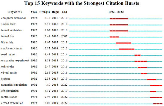 Figure 7 lists the 15 words with high burst intensity in the keyword analysis of this study. By analyzing the burstiness of keywords in a certain time period, the evolution and development of underground space evacuation can be further explored [53]. From Figure 7, it can be seen that the dynamic development process of research on underground space evacuation from 1992 to 2022 can be divided into three stages.