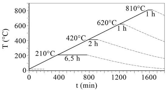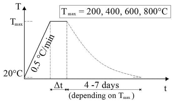 The mechanical properties (compressive strength, stress–strain relation, and modulus of elasticity) of cylindrical SCC specimens Ø150 × 300 mm exposed to high temperatures (0, 200, 400, 600, 800 °C) were determined according to RILEM TC 200-HTC [65] and EN 12390-13 [60]. The SCC specimens were de-moulded 24 h after casting and placed in a water tank. At 28 days of age, the specimens were removed from the water tank and stored at a laboratory room temperature of 20 ± 2 °C and a relative humidity of 30 ± 5%. At one year of age, the specimens were dried in an oven at 105 °C until the weight change was less than 0.1% and then they were exposed to high temperatures. According to the RILEM recommendations [65] and the diameter of the cylindrical SCC specimens, a constant value of the heating rate of 0.5 °C/min was adopted. Thirty cylindrical SCC specimens were prepared from each SCC mixture, six specimens for each of the test temperatures (0, 200, 400, 600, 800 °C). The specimen temperature change was monitored at the specimen surface and centre with K-type thermocouples while the furnace temperature change was monitored with a probe. The applied heating and cooling rates are shown in Figure 1, with introduced intervals at maximum temperatures shown in Figure 2. Upon completion of the heating process, the specimens were left in the furnace until reaching room temperature. In addition to the mechanical properties already mentioned, various other parameters were observed and studied: change in mass and colour, ultrasonic pulse velocity (UPV), explosive spalling, crack development, and microstructural changes by using a scanning electron microscope (SEM).