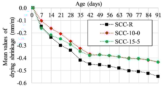 The drying shrinkage of investigated SCC mixtures is presented in Figure 3. The values presented are the mean values of three prisms. After 7 days, the mean drying shrinkage of SCC-R is 43% higher and 9% lower compared to the mean drying shrinkage of SCC-10-0 and SCC-15-5, respectively. Furthermore, the SCC-15-5 mixture shows the highest mean values of drying shrinkage, which can be explained by the higher fineness of silica fume compared to cement. As the shrinkage of concrete causes stresses, cracks occur, meaning that the process of concrete shrinkage is an unfavourable occurrence in terms of concrete serviceability. Therefore, the value of the concrete shrinkage must be as low as possible, especially in the first days after concreting, indicating that the SCC-10-0 mixture is the best in these terms (36% lower average drying shrinkage after 7 days, compared to the SCC-15-5 mixture). Between the 14th and 91st day, reference SCC mixture SCC-R has the highest value of drying shrinkage compared to mixtures SCC-10-0 and SCC-15-5, up to 45% and 27%, respectively, which is in line with test results reported by [6], but also in contradiction with some of the test results reported in [5,12]. The reduced drying shrinkage of mixtures with waste rubber can be explained by increased deformability, mostly since recycled rubber is more elastic than natural aggregate and it does not bind water molecules to itself. It can be concluded that replacing natural aggregate with recycled rubber has a positive effect on drying shrinkage. Recycled rubber contributes to the potential reduction in the number and size of cracks in SCC specimens, which consequently provides higher durability and lower maintenance costs of concrete during the design life of the building. The drying shrinkage of investigated SCC mixtures can be predicted with high accuracy () using logarithmic regression equations based on Figure 3: