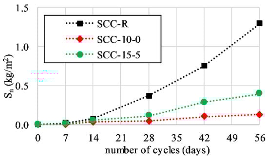 The mean values of the mass of scaled material after 56 freeze–thaw cycles () are presented in Figure 4. For all observed cycles, the mean values of the mass of scaled material were the highest for the reference SCC mixture and lowest for the SCC-10-0 mixture. Furthermore, with 15% recycled rubber, the mass of the scaled material after 7, 14, 28, 42, and 56 freeze–thaw cycles was smaller compared to the mass of the scaled material of the reference SCC mixture. After 7 and 14 freeze–thaw cycles, the difference between the mean values of the mass of scaled material was less visible. After 28 freeze–thaw cycles there was a significant increase in this difference, most pronounced after 56 freeze–thaw cycles, where the mass of the scaled material of the mixture SCC-R was 10 and 3 times higher than the mass of scaled material of mixtures SCC-10-0 and SCC-15-5, respectively. To date, several studies on freeze–thaw resistance of traditional concrete with rubber have been carried out with similar test results [22,24,25,26]. However, the results of several studies have shown the opposite [26,27], at least in terms of a higher percentage of replacement of natural aggregate with rubber. Liu et al. [26] concluded that the positive effect of rubber on the concrete freeze–thaw resistance is expressed only up to 5% replacement of natural aggregate with recycled rubber, which is not the case in this study where better resistance to freeze–thaw cycles was achieved with higher replacement levels.