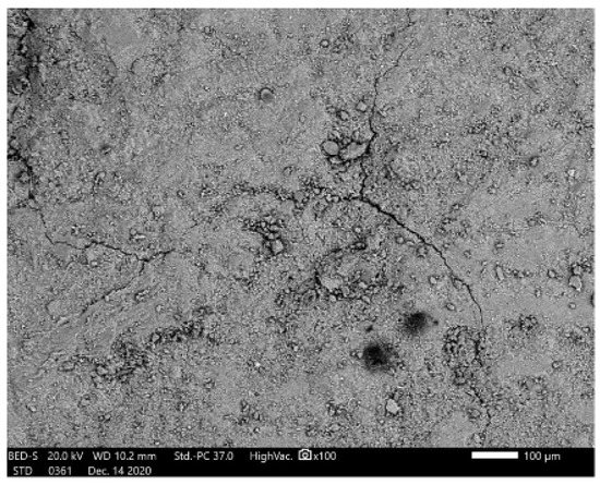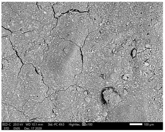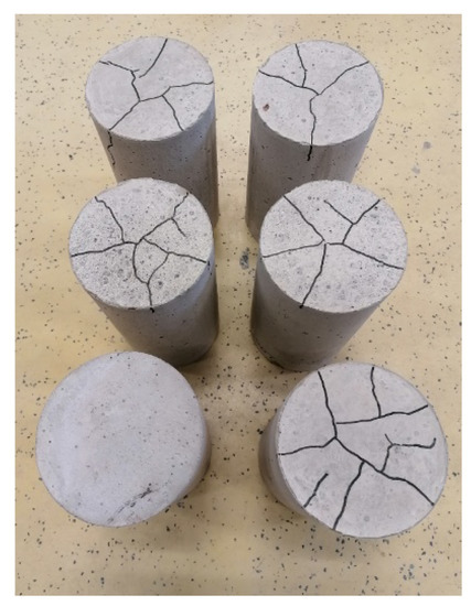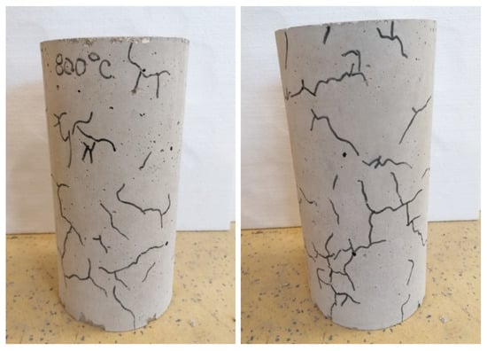After exposure to high temperatures, the occurrence of cracks is typical for reference SCC specimens at 400, 600, and 800 °C. After exposure to 400 and 600 °C, cracks appeared at the bottom of the specimen (Figure 5), while after exposure to 800 °C, cracks appeared along the height of the concrete specimen (Figure 6). The number of cracks in the specimens of the reference SCC mixture increases with the increase in temperature. According to Yüzer et al. [29], at the moment of cooling, calcium oxide CaO passes into calcium hydroxide Ca(OH), which then travels through the pores of the concrete leading to an increase in volume and the appearance of larger cracks.