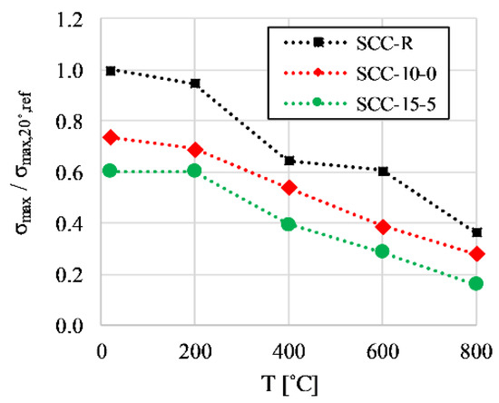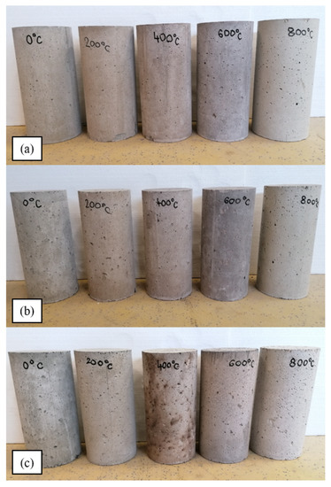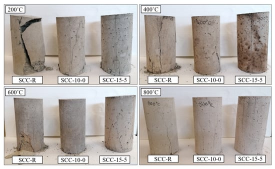 The change in colour of SCC specimens was controlled by visual inspection after exposure to high temperatures (Figure 7). Table 5 provides a proposal for visual recognition of concrete conditions after exposure to high temperatures, enabling the determination to which temperature the concrete was exposed. Similar to previous test results [31,32], the specimens become pink-grey, brown-grey, or dark-grey after being exposed to 200, 400, and 600 °C, respectively. However, specimens SCC-15-5 exposed to a temperature of 400 °C become brown-grey with brown spots, which can be explained by the fact that more recycled rubber, containing carbon, has burned out [31]. When specimens were exposed to 800 °C, the colour of the concrete changed from light-grey to white-grey, regardless of whether recycled rubber is one of the concrete components or not. During exposure of specimen SCC-15-5 to a temperature higher than 400 °C smoke was observed, caused by decomposition and combustion of large quantities of recycled rubber, which mainly consists of carbon and hydrogen [30]. Smoke has not been reported in any of the previous studies. When exposing SCC specimens of mixtures SCC-R and SCC-10-0 to temperatures higher than 400 °C, the amount of smoke is negligible. In terms of user safety, 10% replacement of natural aggregate with recycled rubber would be optimal, so as not to additionally endanger human health in case of fire or high temperatures. However, it should be noted that structures without additional layers such as plaster on the inside or layers of thermal insulation on the outside are rarely constructed. Taking this into consideration, it can be assumed that in the early stages of fire the appearance of smoke would not play a crucial role in such a hazard scenario, and later stages of fire present structural danger which is far more threatening.