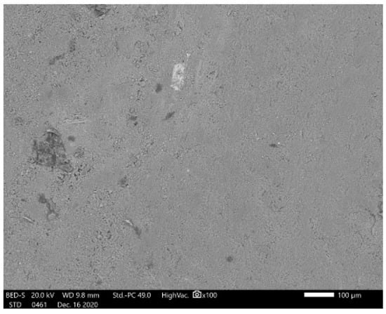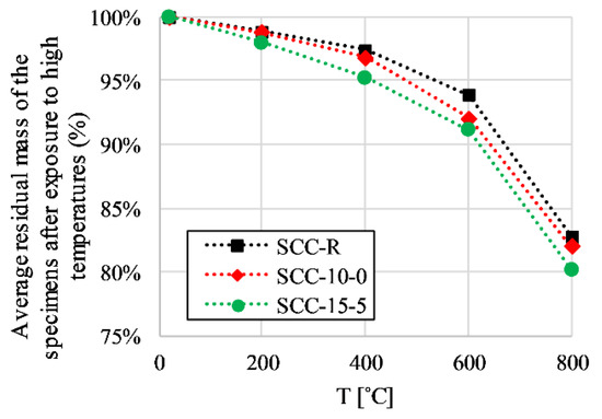 Figure 8 shows the average residual mass of the specimens after exposure to high temperatures. There is a slightly higher mass loss in concrete specimens with rubber, similar to the results reported by [32,33]. This is due to the combustion and decomposition of recycled rubber, consequently leading to an increase in the weight loss of the concrete specimens. Mass loss at temperatures up to 150 °C is also present due to the evaporation of the capillary water and the water contained in the C-S-H gel. At higher temperatures, chemically bound water is released from concrete during the decomposition of calcium hydrate into calcium oxide and water [33]. However, it should be noted that the differences in mass loss of SCC mixtures with recycled rubber compared to the reference SCC mixture are quite small. At 512 °C calcium hydroxide (Ca(OH)) decomposes into water (H2O) and calcium oxide (CaO) [73], leading to the largest decrease in average residual mass for all mixtures between temperatures of 600 and 800 °C since the value of mass loss depends on the duration of the temperature load [74,75]. It can be concluded that the composition of the concrete mixture, which is partially modified with the addition of rubber and silica fume, has no significant effect on increasing or decreasing specimen mass loss when exposed to the same high temperature. Increasing the temperature to which the concrete is exposed decreases the mass, which indicates an increase in the porosity of concrete and thus a decrease in mechanical properties.