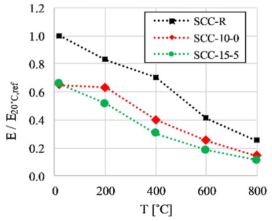 The values of the modulus of elasticity of the specimens of all concrete mixtures were above 20 GPa even after exposure to a temperature of 200 °C. For specimens of the SCC mixtures SCC-10-0 and SCC-15-5, the modulus of elasticity value falls below 20 GPa only after the specimens were exposed to temperatures higher than 400 °C. Compared to SCC specimens with 10 and 15% recycled rubber, the modulus of elasticity of the reference SCC mixture was higher at all exposure temperatures. However, observing the relative reduction in the modulus of elasticity at high temperatures to those at room temperature ( °C), it can be concluded that the specimens of the reference SCC mixture experienced the highest reduction in the modulus of elasticity after exposure to a high temperature of 200 °C, while at the same temperature specimens with 10% rubber had a relative reduction of only 2%. For specimens with 10% rubber exposed to temperatures of 400 °C, this ratio of relative reduction was more pronounced. The specimens SCC-15-5 had the most pronounced relative reduction in the modulus of elasticity at all high temperatures. These trends coincide with the strong correlation of compressive strength and modulus value in general when it comes to concrete, but only a small number of researchers have studied the change in the static modulus of elasticity of concrete with rubber with similar observations [33]. Therefore, it can be concluded that the same causal effects of the high temperature determined for compressive strength are valid for the elastic modulus.