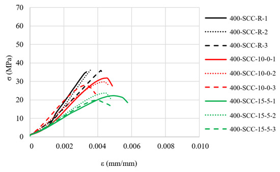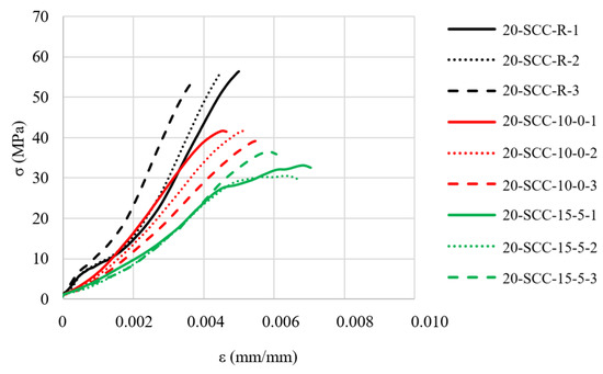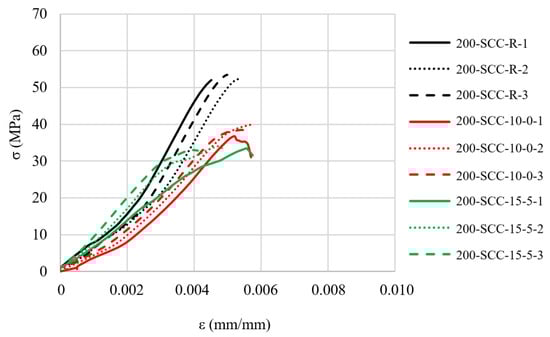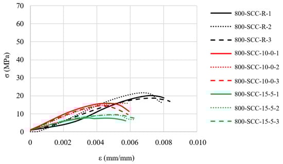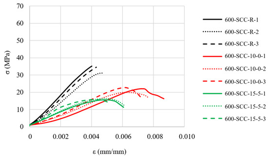 Test results are presented in Table 7 and Figure 9 and Figure 10, while Figure 11, Figure 12, Figure 13, Figure 14 and Figure 15 show a comparison of the stress–strain curves for three specimens of the investigated SCC mixtures, for all test temperatures (total of nine curves per graph).